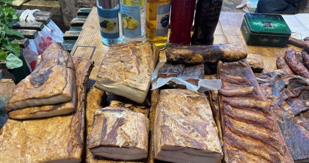 Osim raznovrsnog voća i povrća, jutros je na pijaci bila i pršuta, kilogram i do 30 eura, domaća slanina od 10 do 18 eura, a kobasica i do 25 eura po kilogramu. Štandovi su bili puni različitih vrsta sireva, koji po kilogramu koštaju od 15 eura.
